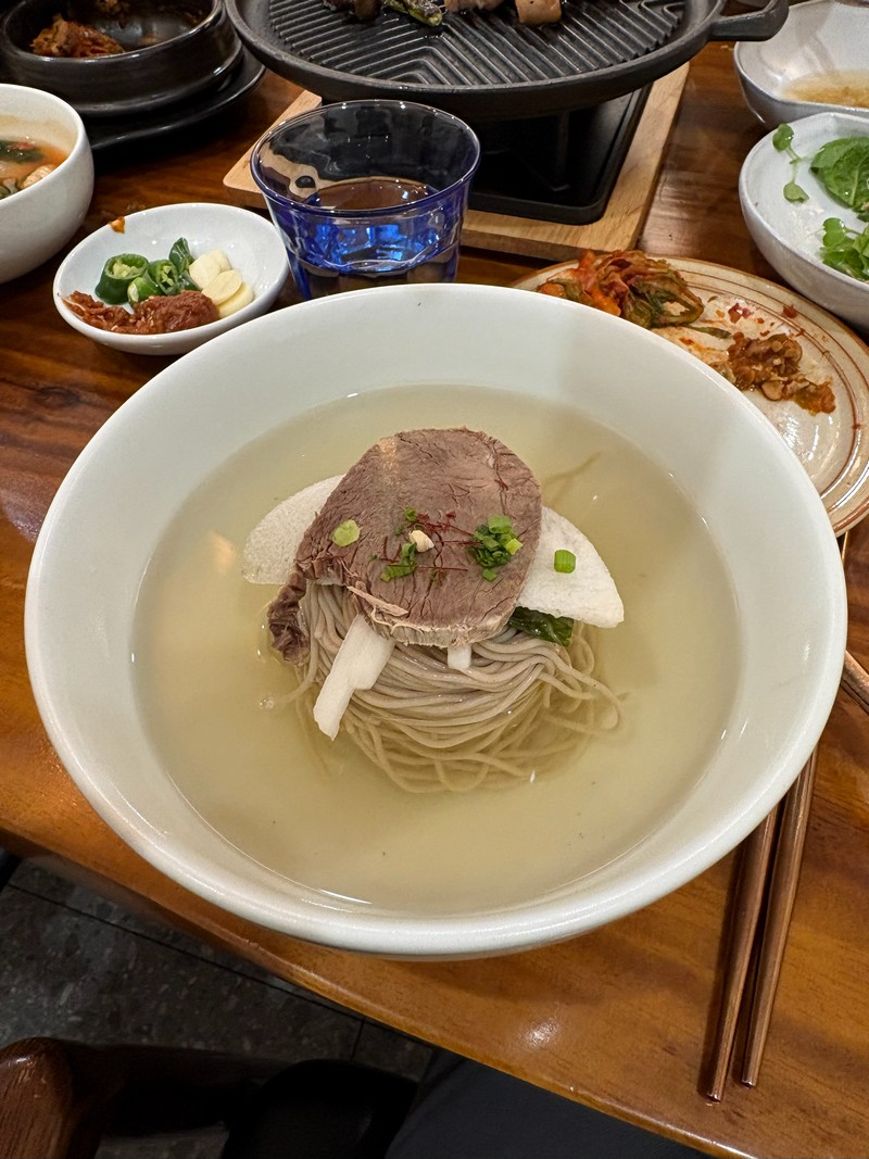 아주 깔끔하고 담백한 국물에 면은 메밀면이라 냉면 면 안 짤려서 앞니로 지그재그 짜르면서 추태부릴 일이 없다.