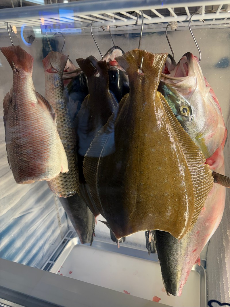 가게 안 냉장고에서 방어랑 광어랑 도미랑 숙성이 되고 있다.