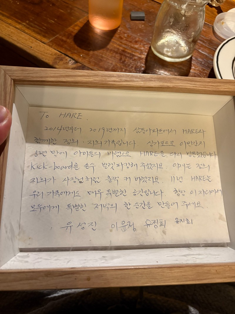 삼풍 살다 싱가폴 이민간 가족의 감동적인 메모가 바에 장식되어 있다.
