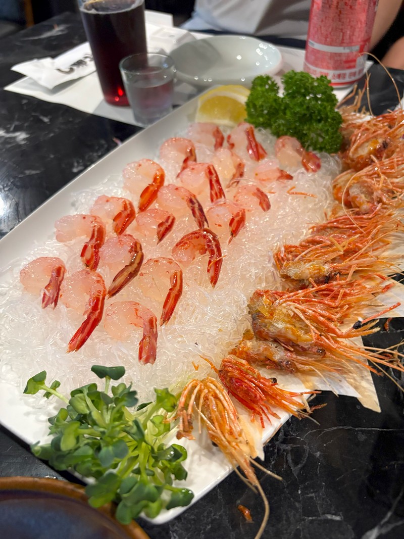 날이 매우 덥던 날, 언능 드가자마자 새우랑 맥주를 주문했다.